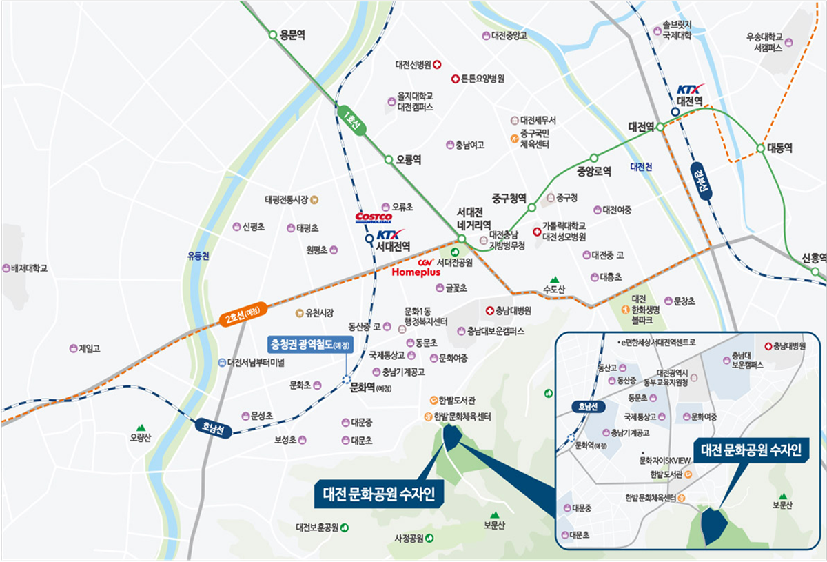 충남대병원, 코스트코, CGV, 문화체육센터, 한화생명 볼파크 등